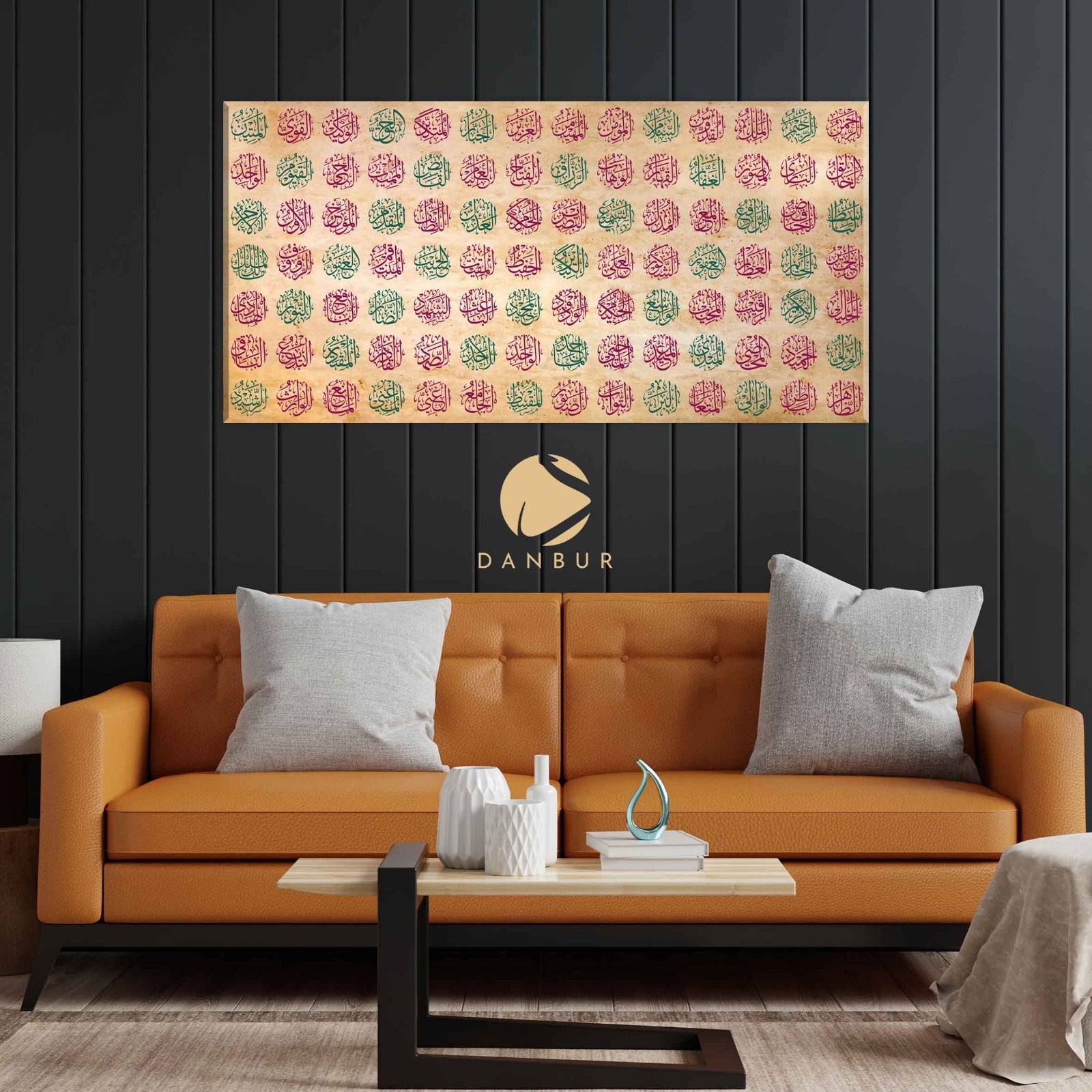 This captivating design is a masterful display of Asma’ul Husna — the 99 beautiful names of Allah — each rendered in elegant Arabic calligraphy, lovingly arranged in a structured yet harmonious layout.