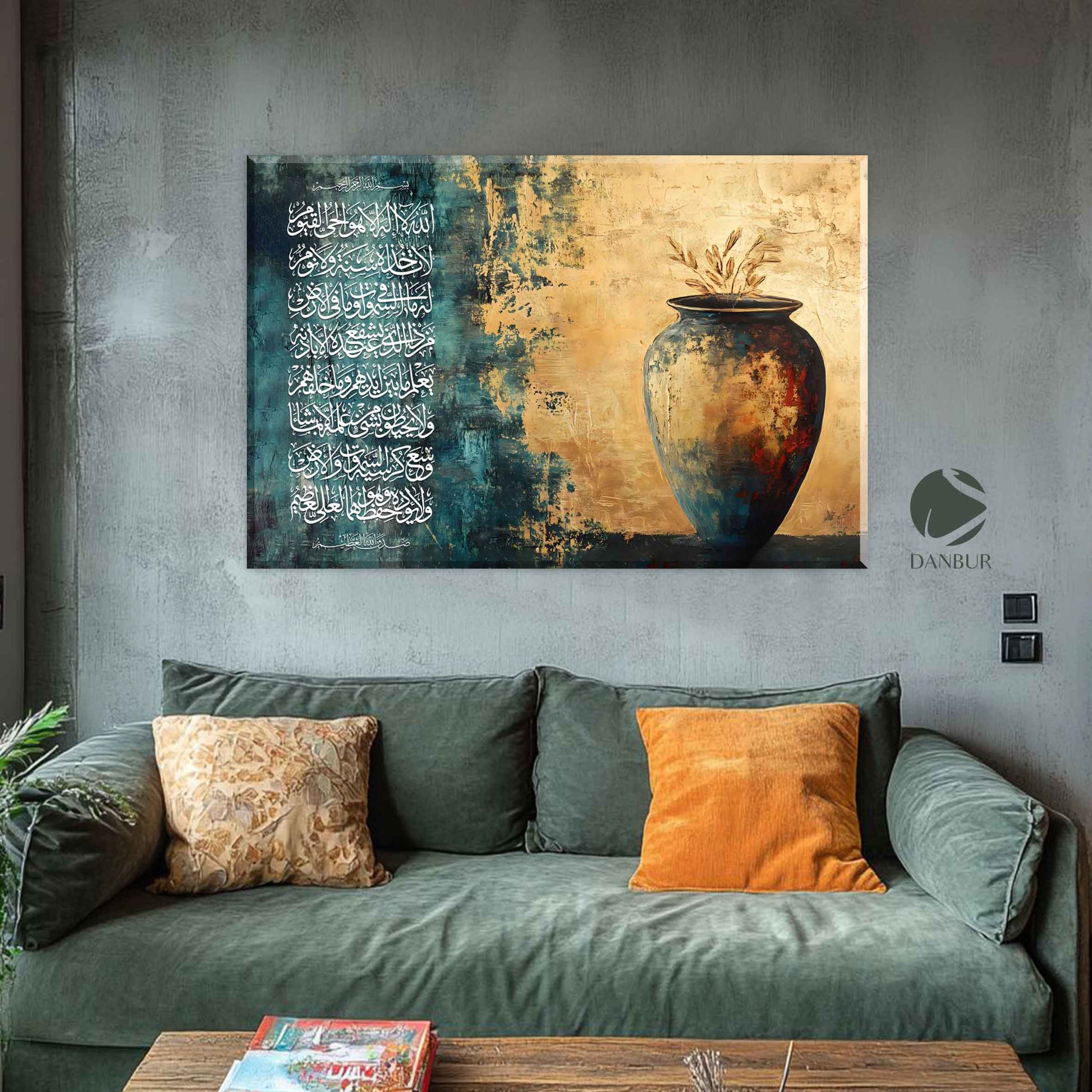 Elevate your space with this breathtaking Ayatul Kursi canvas wall art – where sacred scripture meets soulful design. Set against a mesmerising blend of deep teal and rich gold hues, this piece invites serenity, reverence, and timeless beauty into any room.