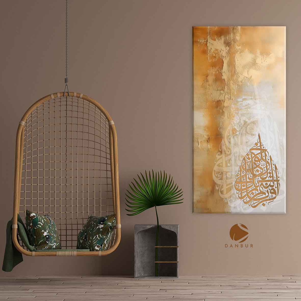 This contemporary Arabic calligraphy artwork features the first revealed verse of the Qur’an — "Iqra’ bismi rabbika alladhi khalaq" — layered delicately over textured creams, sands, and soft earthy golds. A modern expression of timeless knowledge, it speaks to the soul while harmonising effortlessly with warm interior tones.