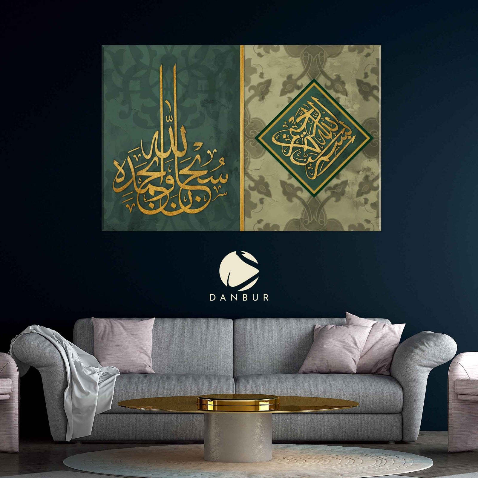 This majestic artwork pairs two of the most spiritually rich phrases in Islam — Tasbih and Bismillah — in a twin-panel design that radiates beauty, barakah, and balance. Rendered in a glowing gold script on lush emerald and olive backdrops, this canvas is a celebration of remembrance and divine beginnings.