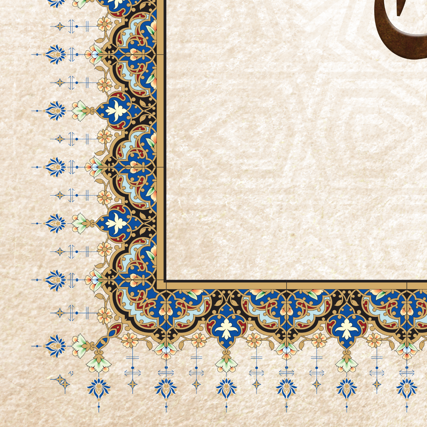 • Royal blue floral tazhib borders lend a regal frame, connecting the viewer to classical Islamic manuscript art, enhancing a sense of heritage and sacredness.