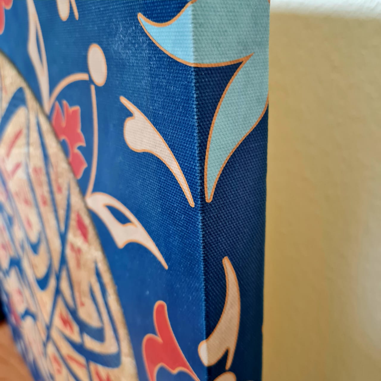 Step into a world of timeless elegance and divine wisdom. This striking canvas features the Qur’anic verse "لَئِن شَكَرْتُمْ لَأَزِيدَنَّكُمْ" at its heart, encased in a traditional Ottoman floral motif with a contemporary twist. The centrepiece — shimmering with gold textures, crimson strokes, and deep indigo calligraphy — makes a bold, noble statement of faith and gratitude.