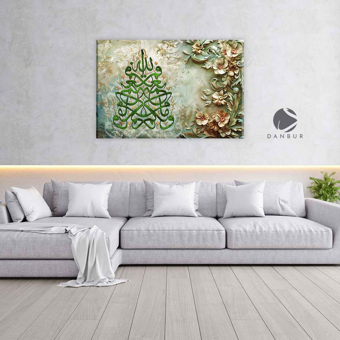 A graceful celebration of gratitude, this canvas artwork weaves the verse "وَمَا بِكُم مِّن نِّعْمَةٍ فَمِنَ ٱللَّهِ" into a richly textured scene of blooming florals, sculpted scrolls, and soothing mint tones. The calligraphy is composed in an intricate tree-like formation, symbolising abundance and divine origin — a reminder that all beauty, peace, and success comes solely from Allah.