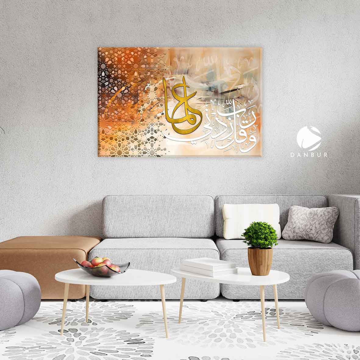 Rich in symbolism and design, this artwork presents the timeless Qur’anic prayer for knowledge with layered meaning and visual brilliance. The golden word "علم" (knowledge) is central, glowing against an earthy spectrum of amber, clay, and soft blue, conveying both the divine warmth of wisdom and the grounding depth of sacred learning.