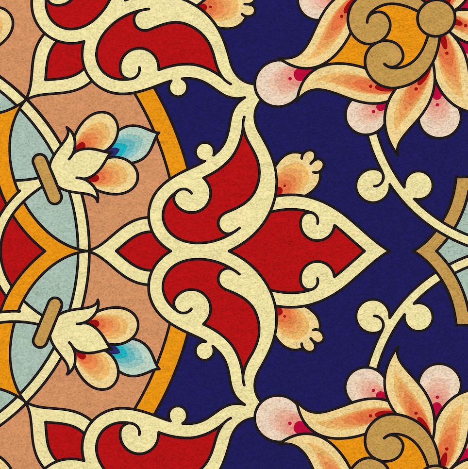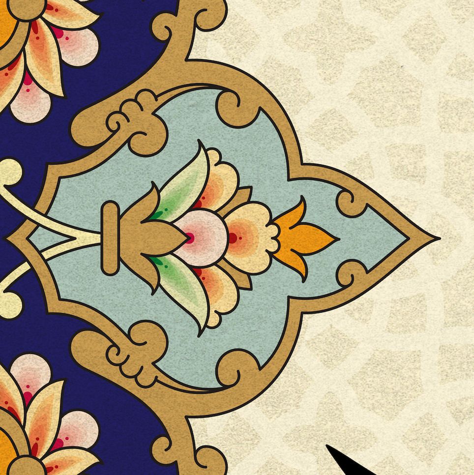 • Bold Tazhib Floral Mandala: A burst of traditional colours — red, navy, peach, and turquoise — bringing energy, focus, and artistic richness to the canvas.