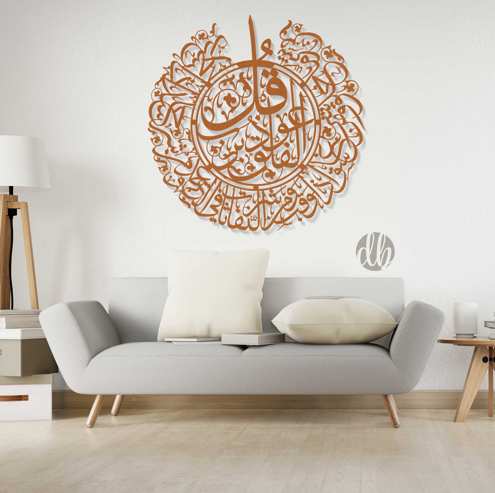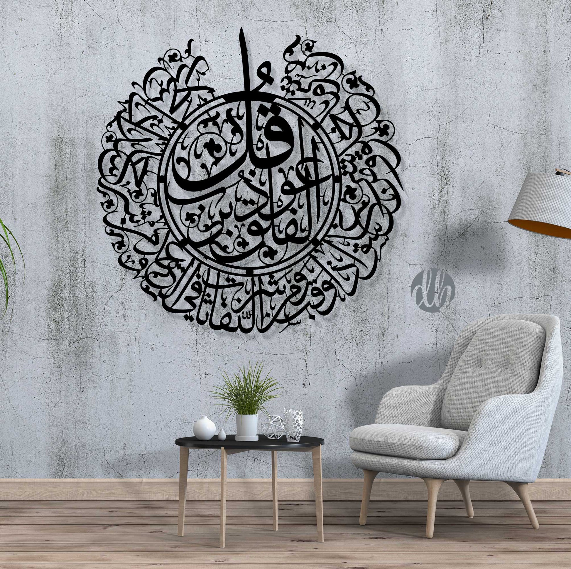 Surround yourself with divine light and protection through this masterfully designed Surah Al-Falaq wall art, written in fluid Thuluth Arabic calligraphy and shaped into a radiant circular motif. This is more than art – it’s an invocation for safety, serenity, and Allah’s safeguarding in your home.
