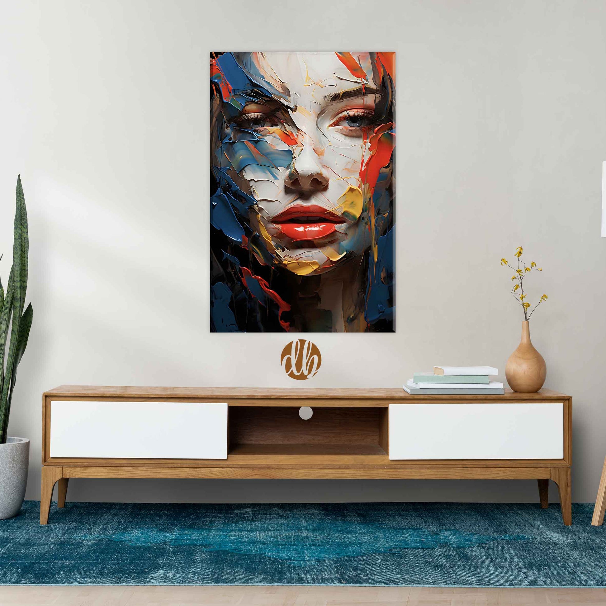 This bold canvas captures a captivating human face immersed in a whirlwind of colours, showcasing the perfect harmony between intensity, passion, and artistic chaos.